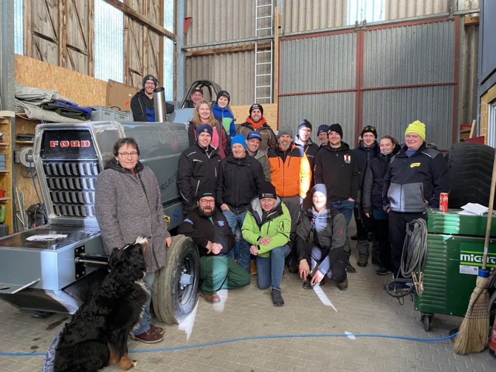Gruppenbild mit Pulling-Traktor. Vorne links kniend: Roman Gilgen. Auf dem Traktor-Sitz: Benjamin Scheuner.
