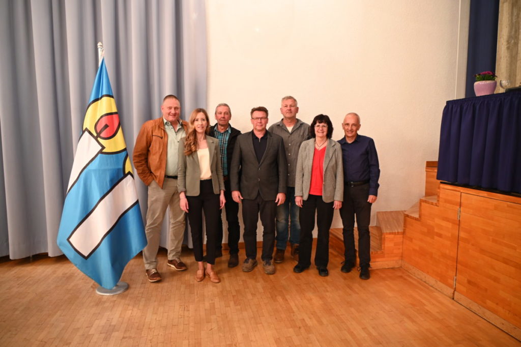 Die letzte gemeinsame Gemeindeversammlung des alten Kerzerser Gemeinderats (v.l.): Urs Hecht, Andrea Kaufmann, Fredy Moser, Daniel Wattinger, Adrian Tschachtli, Corinne Nippel und Jörg Bönzli.