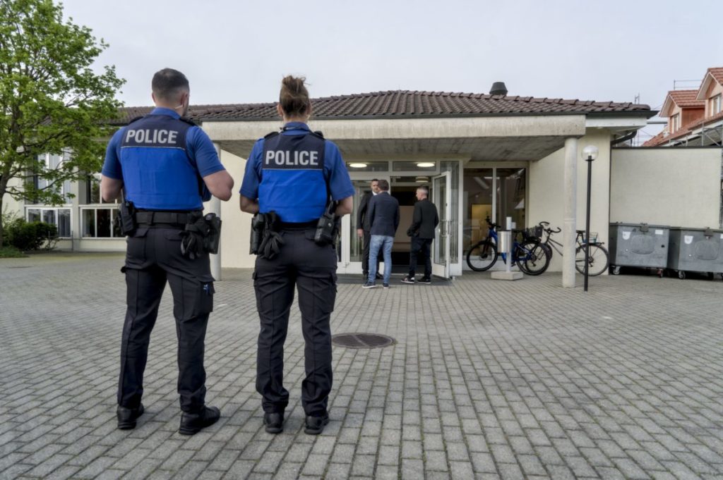 Polizeiangehörige vor der Seelandhalle in Kerzers, wo am Freitag der Gedenkanlass für die Opfer des Busunglücks vom 10. März 2026 stattgefunden hat.